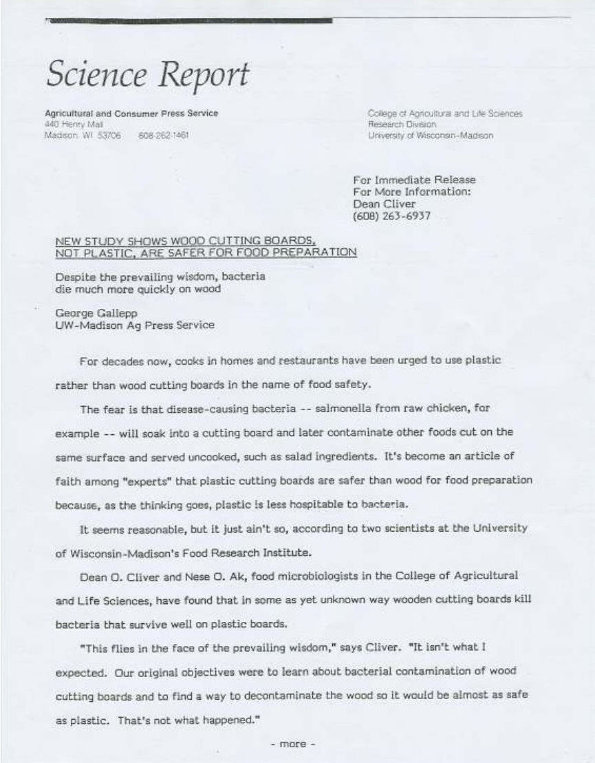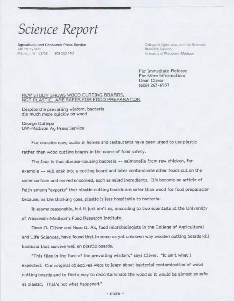 Well in 1993 Microbiologists at the University of Wisconsin’s Food Research Institute were studying which was more sanitary, wooden cutting boards or plastic cutting boards. In their experiments they contaminated both wooden and plastic cutting boards with multiple bacteria strains that cause food poisoning. The results between the two were very distinct. Without washing, tampering or exposing them to light, the bacteria on the wooden board died off within three minutes. The results on the plastic boards were completely different. The bacteria not only remained but actually multiplied significantly overnight. What they discovered is that it seems wood has natural bacteria-killing properties that plastic and glass don’t.