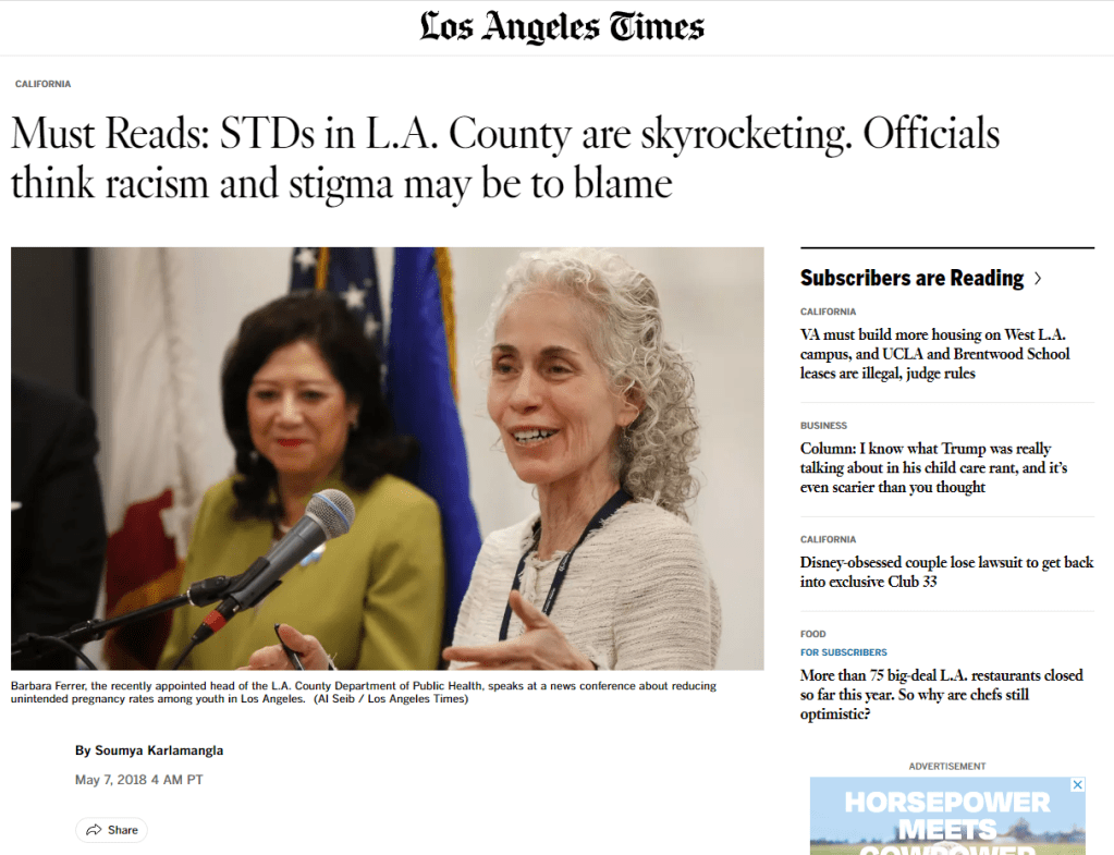 Well according to the LA Times the cause of these infections isn’t immorality or sin. The cause is racism. The title of the article reads “STDs in L.A. County are skyrocketing. Officials think racism and stigma may be to blame”.